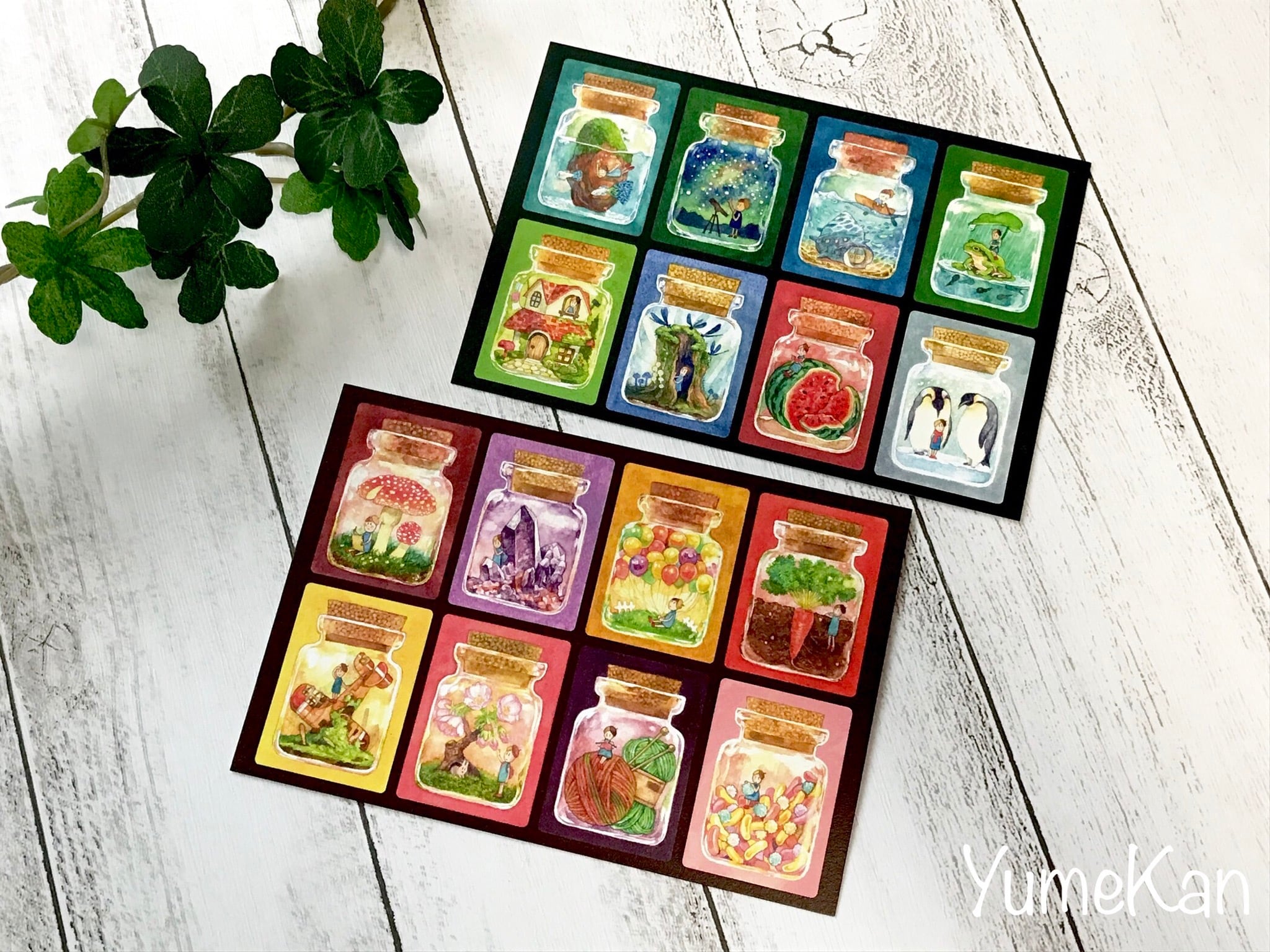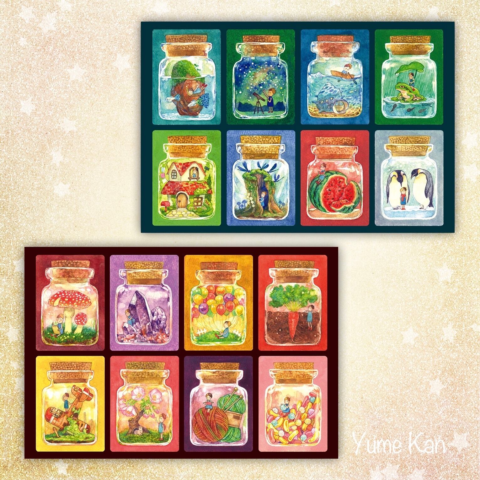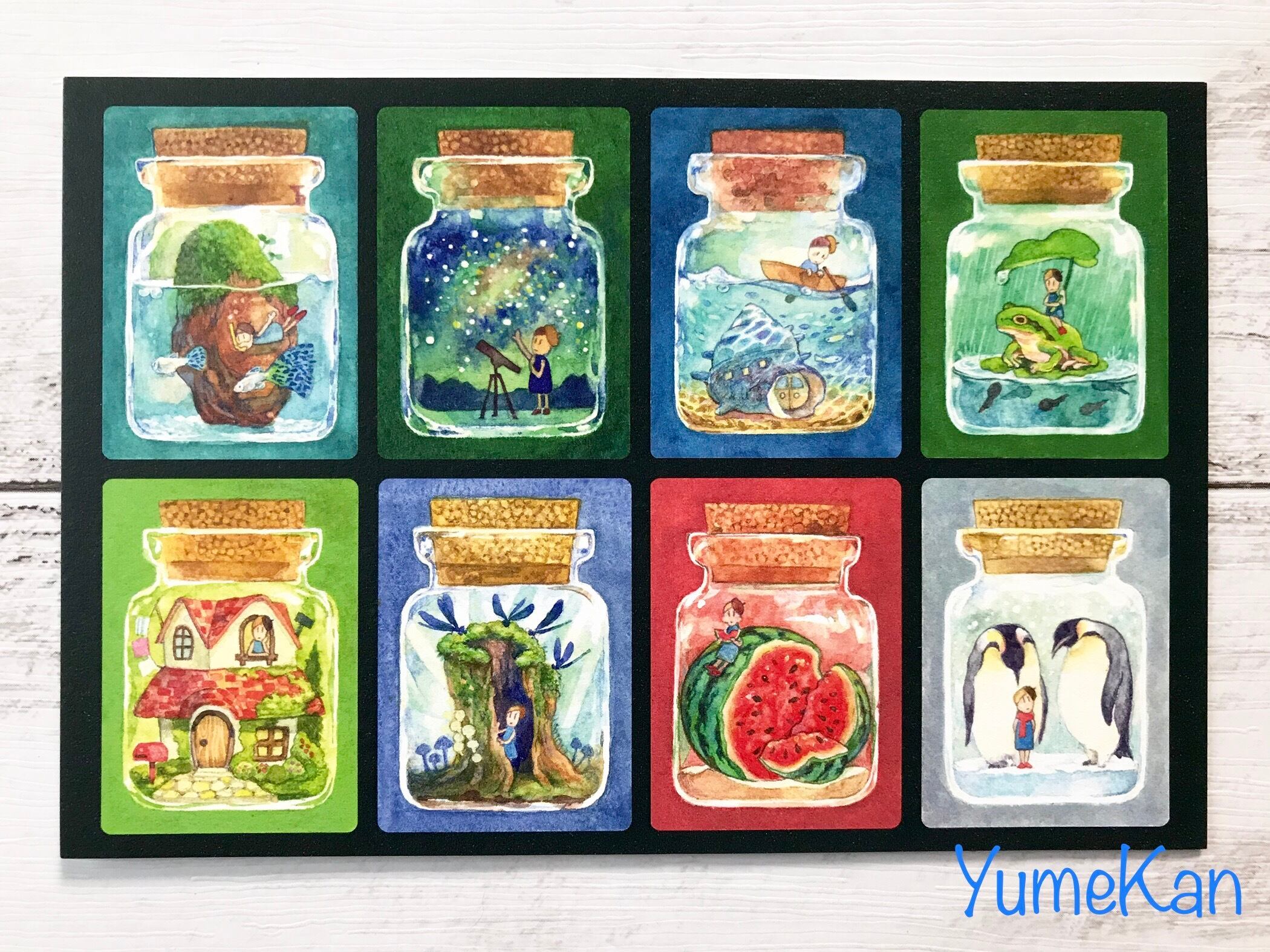 小瓶に詰められた小さな世界を描いたシリーズを、ポストカードにしました。