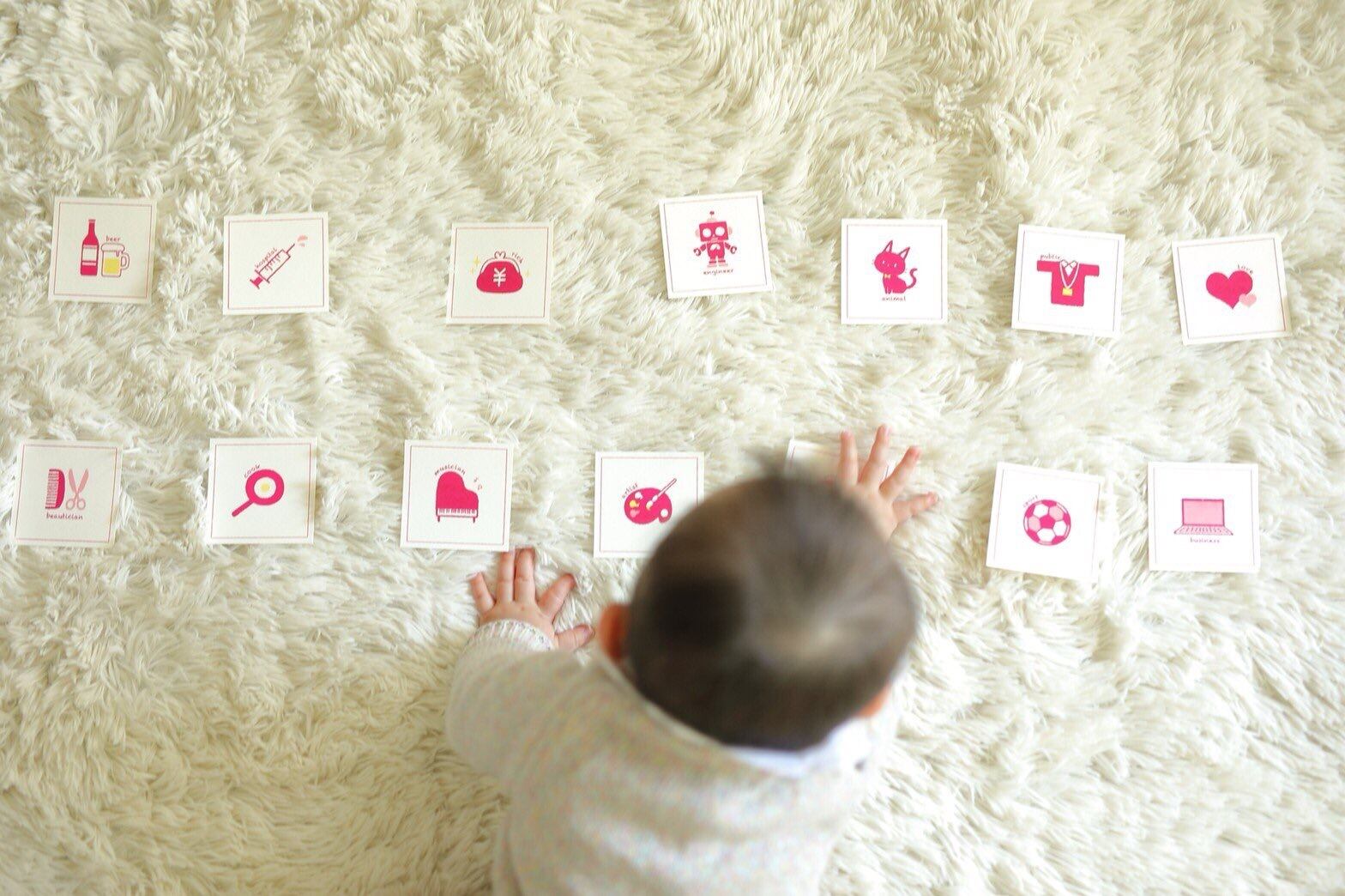 赤ちゃんから少し離れた場所にカードを並べて、最初に手に取ったものでその子の将来を想像してみてください。